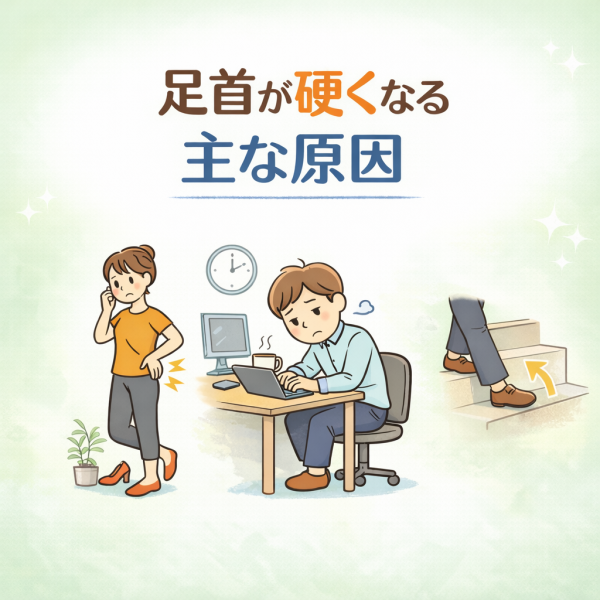 そんな声は意外と多いものです。実は足首の硬さは、日常の過ごし方や体の使い方と深く関係していると言われています。ここでは、よく見られる原因を3つの視点から整理していきます。