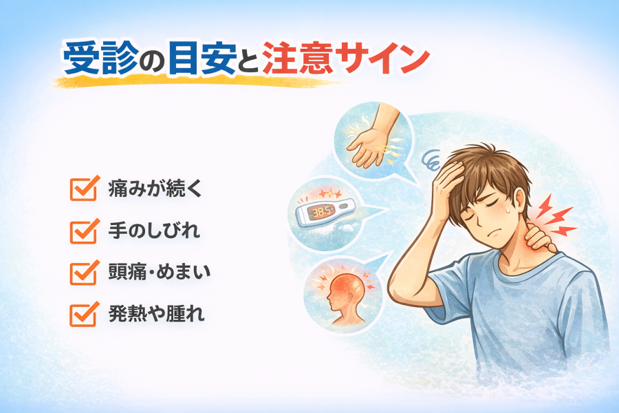 発熱や明らかな腫れがある場合、炎症など別の原因が関与している可能性もあると言われています。首の痛みだけで判断せず、全身の状態もあわせて見ることが大切だそうです。