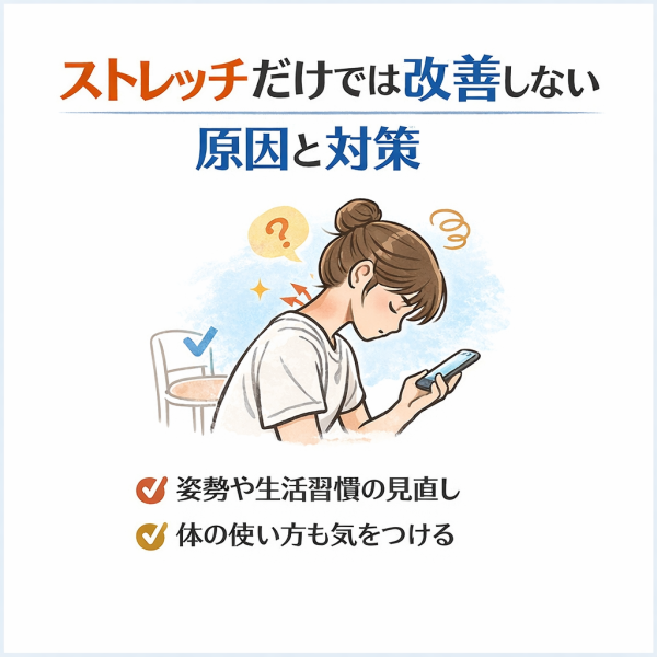 姿勢のクセや体の使い方、生活習慣などが影響しているケースでは、ストレッチだけでは対応しきれないこともあると考えられています。そのため、原因を一度整理してみることが重要だとされています。