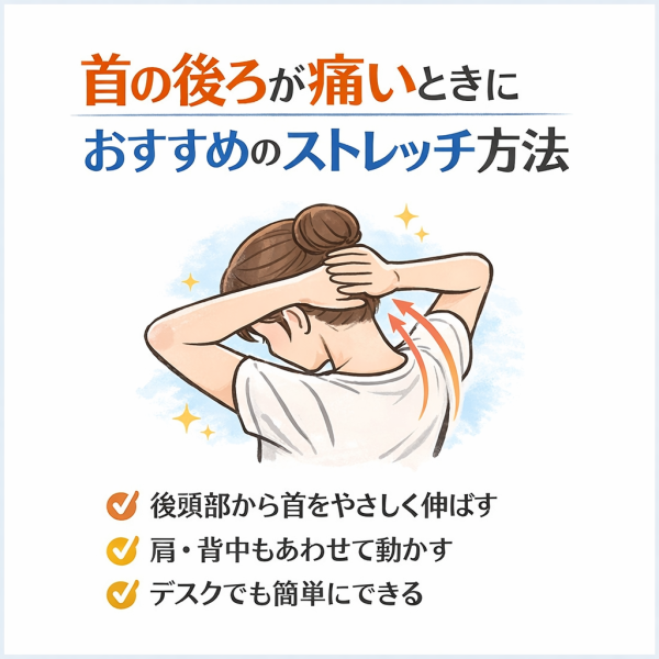 首の後ろの痛みは、筋肉のこわばりや姿勢の影響が関係しているケースが多いとされており、やさしく伸ばすことで負担が軽減しやすくなる場合もあるようです。ただし、強く引っ張るような動きは逆に刺激になることもあるため、無理のない範囲で行うことが重要だと考えられています。