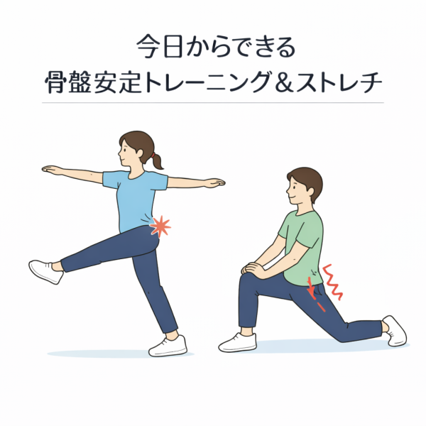 骨盤の正しい動きを支えるためには、股関節と体幹の安定が欠かせないと言われています。たとえば中殿筋を意識した片脚立ちや、体幹を使うブリッジ運動は基本的なエクササイズとして紹介されています。引用元:https://ligare-matsudo.com/ligarejournal/1175/