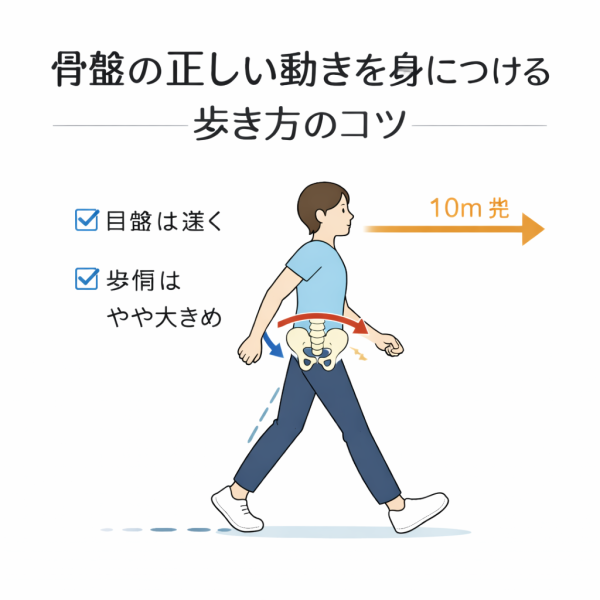 歩いたときの骨盤の正しい動きを身につけるためには、まず姿勢を整えることが基本とされています。視線を約10m先に向け、あごを軽く引き、背すじを自然に伸ばす姿勢が理想的だと言われています。引用元:https://yatsu-cs.com/column/detail/20251215093331/