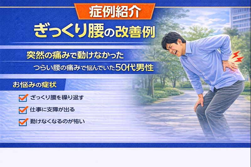 朝の動作で突然動けなくなった30代男性のケース 患者様の状況・症状 患者様は30代男性(デスクワーク・営業職) 当院の問診・検査方法 さかぐち整骨院では、ぎっくり腰のような急性の痛みでも、無理に動かさず、安全な範囲で原因を確認することを最優先にしています。 骨盤の動きの硬さ・股関節の可動域低下・体幹の支える力の低下が重なり、腰に一気に負担が集中した状態だと判断しました。 施術後の変化 【1回目】 施術後、立ち上がり動作が少し楽になり、「動ける感じが出てきた」と変化を実感。 大切にしたこと 初回は無理をさせないこと・安心感を作ることを最優先にしました。 【2回目】 歩行が安定し、日常動作が少しずつスムーズに。 大切にしたこと 動作の怖さを減らし、正しい動きを思い出してもらうことを意識しました。 【3回目】 日常動作での痛みが大きく減り、仕事への不安も軽減。 大切にしたこと 再発予防を意識し、日常生活で腰に負担をかけにくい体の使い方を定着させました。 今後の見込み 現在は動作が安定し、仕事・日常生活ともに支障が少ない状態です。 |