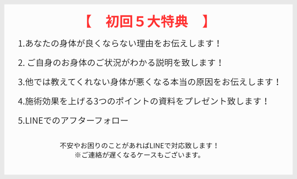 なぜなら、5分程度の短い施術では、症状を根本から改善することが難しいからです。