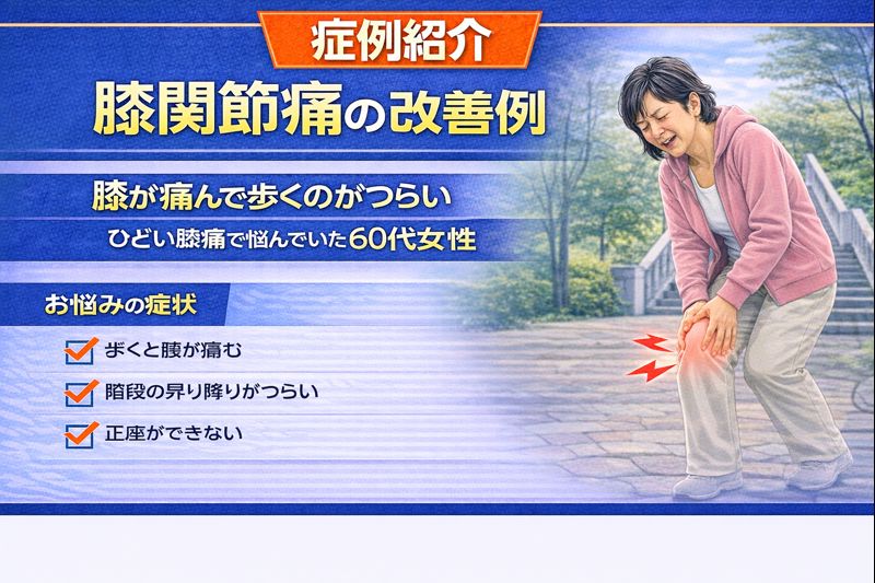 階段の昇り降りと歩行がつらくなっていた60代女性のケース 患者様の状況・症状 患者様は60代女性。 当院の問診・検査方法 さかぐち整骨院では、膝関節痛でも膝だけを原因と決めつけないことを大切にしています。 その結果、股関節の動きの低下と骨盤の不安定さ、歩行時の体重移動の偏りにより、膝に負担が集中している状態だと判断しました。 施術後の変化 【1回目】 施術後、立ち上がり動作がスムーズになり、「膝が軽い感じがする」と変化を実感されました。 大切にしたこと 初回は「動くことへの不安を減らす」ことを最優先にしました。 【2回目】 階段の昇り降りが楽になり、外出時の不安が減少。 大切にしたこと 日常生活で無意識に良い動作が出るように意識づけを行いました。 【3回目】 長く歩いても膝の痛みが出にくくなり、日常生活が楽になってきました。 大切にしたこと 再発予防を意識し、動作の質を安定させることに重点を置きました。 今後の見込み 現在は階段や歩行時の痛みが大きく軽減し、外出も安心して行える状態です。 |