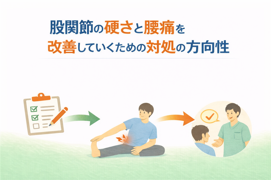 これらの症状は、強い痛みというより「違和感」「重だるさ」「動かしづらさ」として現れることが多い傾向があります。そのため放置されやすい点も注意が必要です。腰だけに注目するのではなく、股関節の硬さや動きの偏りがないかを確認することが、状態を把握するうえで重要と言えるでしょう。