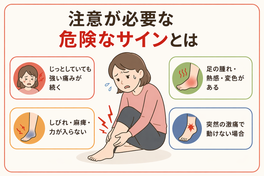 「急に足が痛いけど、これって様子見でいいの?」と迷うこと、ありますよね。実は、同じ“歩けないほどの痛み”でも、注意した方がいいサインがいくつかあると言われています。