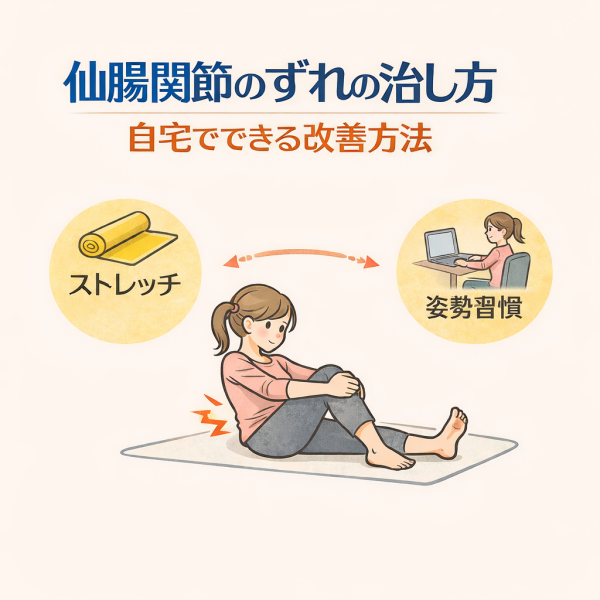 仙腸関節のずれに関しては、関節そのものよりも周囲の筋肉バランスや体の使い方が影響しているケースが多いと言われています。そのため、自宅でのケアも「骨を戻す」というより、「筋肉の状態を整える」ことがポイントになると考えられています。