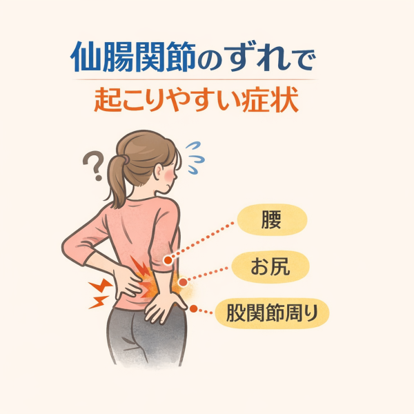 仙腸関節のずれが関係している場合、いわゆる一般的な腰痛とは少し違った出方をすることがあると言われています。特徴としては、腰だけでなくお尻や股関節周囲まで広がるような痛みや、動作によって変わる違和感が挙げられます。