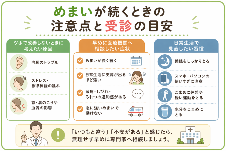 めまいが続く背景には、内耳の問題や自律神経の乱れ、血流の影響などさまざまな要因が関係していると考えられています。そのため、セルフケアだけに頼らず、状態に応じて専門家へ相談することも重要です。