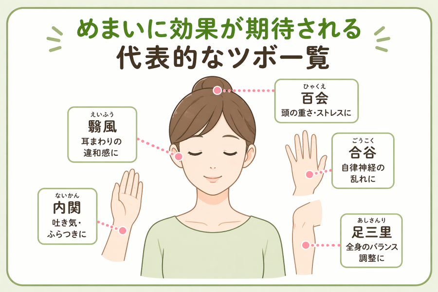 代表的なのは、手首や頭、耳まわり、足などにあるツボです。これらは自律神経のバランスや血流、内耳の働きに関係すると考えられていて、軽く刺激することで体の調整をサポートする可能性があると言われています。