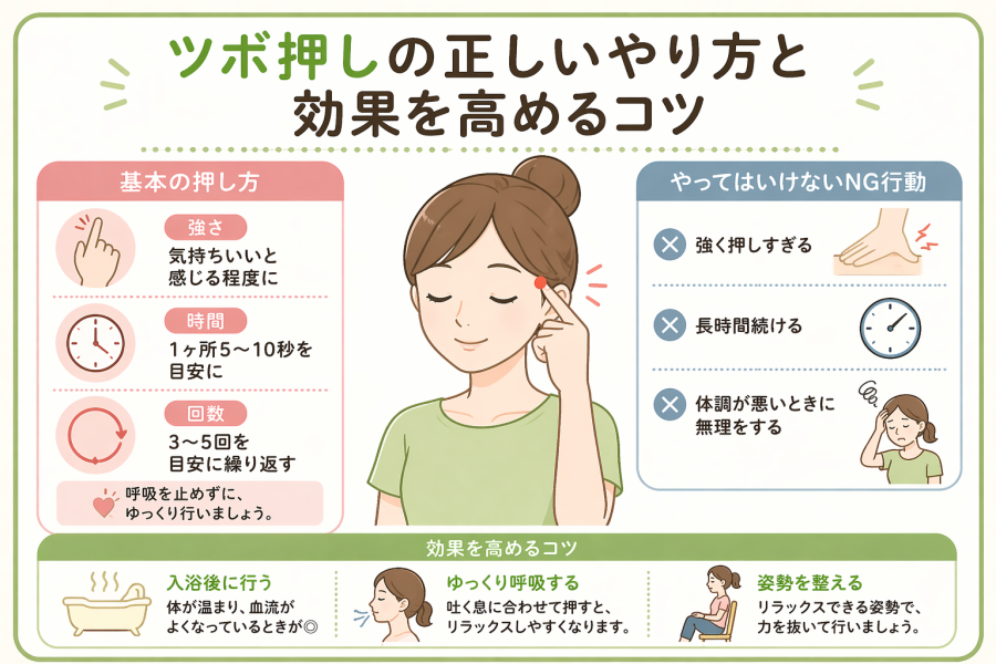 強く押しすぎると体が緊張しやすくなるため、じんわり圧をかけるイメージが大切です。時間は1ヶ所あたり5〜10秒ほどを数回繰り返すくらいが取り入れやすいと言われています。