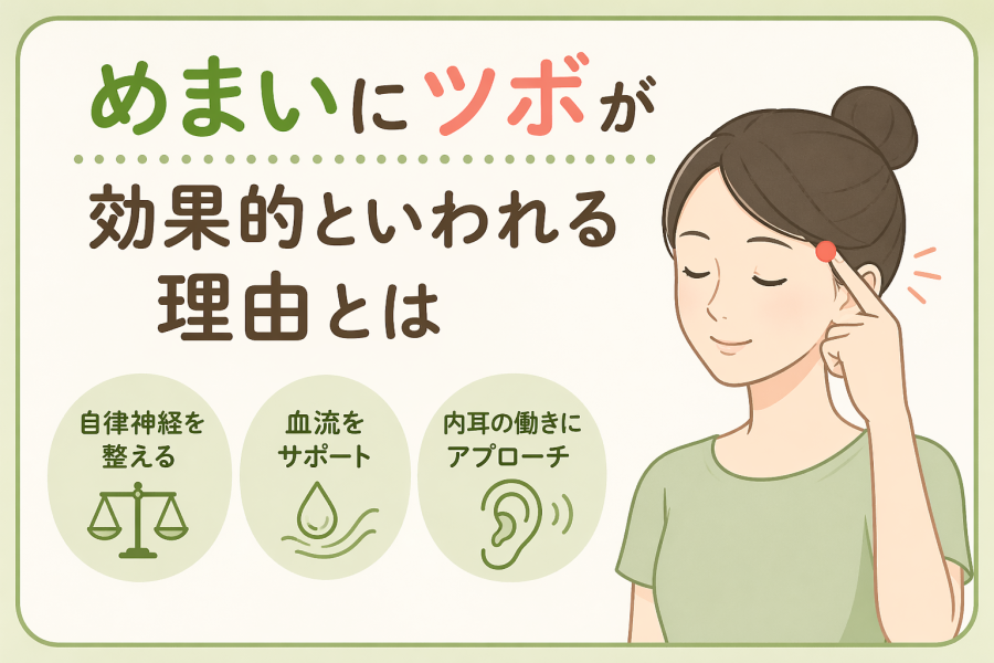東洋医学では、ツボは体の機能を調整するポイントと考えられていて、特に自律神経や血流に影響を与えるとされています。めまいは、ストレスや疲れ、血流の乱れ、内耳の働きなどが関係しているケースが多く、こうしたバランスを整えることが重要です。