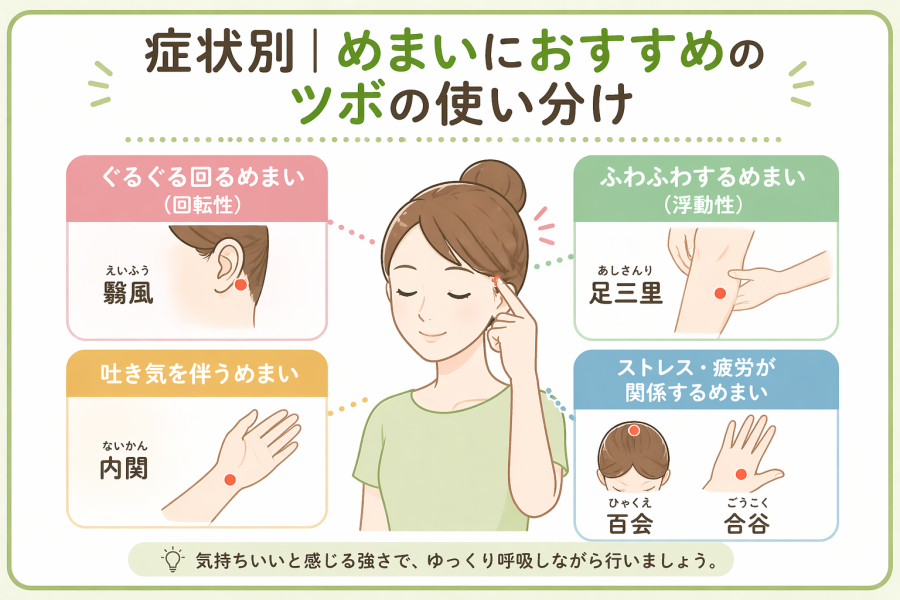 ここでは、よくあるめまいのパターンごとに、ツボの考え方をわかりやすくまとめていきます。