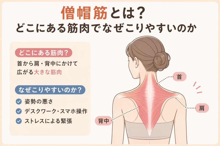実はその原因のひとつとしてよく挙げられるのが「僧帽筋」という筋肉です。首から肩、背中にかけて広がる大きな筋肉で、普段の姿勢や動きにかなり関わっています。