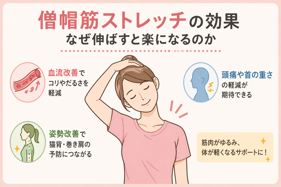 僧帽筋は、日常生活でずっと使われ続ける筋肉のひとつです。そのため、同じ姿勢が続いたり、力が入りっぱなしになると、緊張が抜けにくくなると考えられています。そこでストレッチを行うことで、一度その緊張をゆるめるきっかけをつくることができると言われています。
