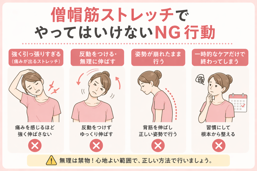 僧帽筋ストレッチはシンプルに見えて、ちょっとした意識の違いで体への影響が変わると考えられています。特に、無理に伸ばそうとしたり、自己流で行ってしまうと、かえって筋肉が緊張しやすくなるケースもあるようです。