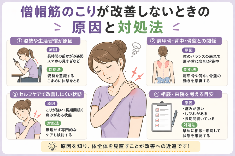 これは、ストレッチを単発で終わらせてしまうことも関係していると言われています。僧帽筋の硬さは、日常の姿勢や習慣と深くつながっているため、一度のケアだけでは変化を維持しづらいと考えられています。