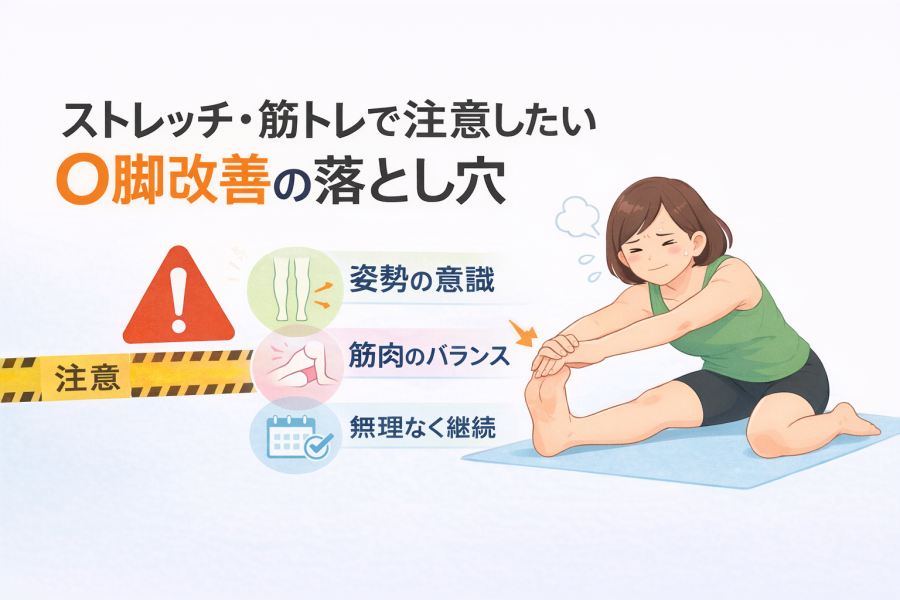 O脚を改善したい一心で、強いストレッチや過度な筋トレを行うと、かえって体のバランスを崩してしまう可能性があると言われています。特に痛みを我慢しながら行うケアは注意が必要です。