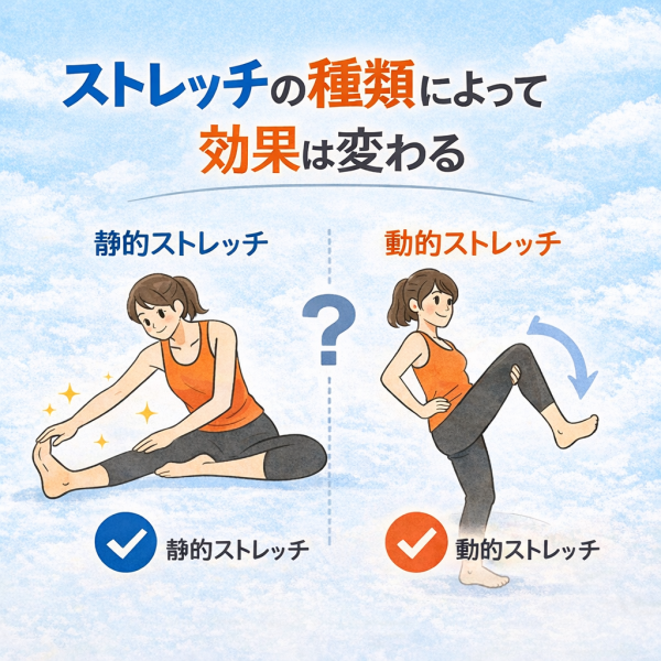 「ストレッチって全部同じじゃないの?」と感じる方も多いですが、実は種類によって体への影響は変わると言われています。大きく分けると“ゆっくり伸ばすタイプ”と“動きながら伸ばすタイプ”があり、それぞれ役割が違うんですね。