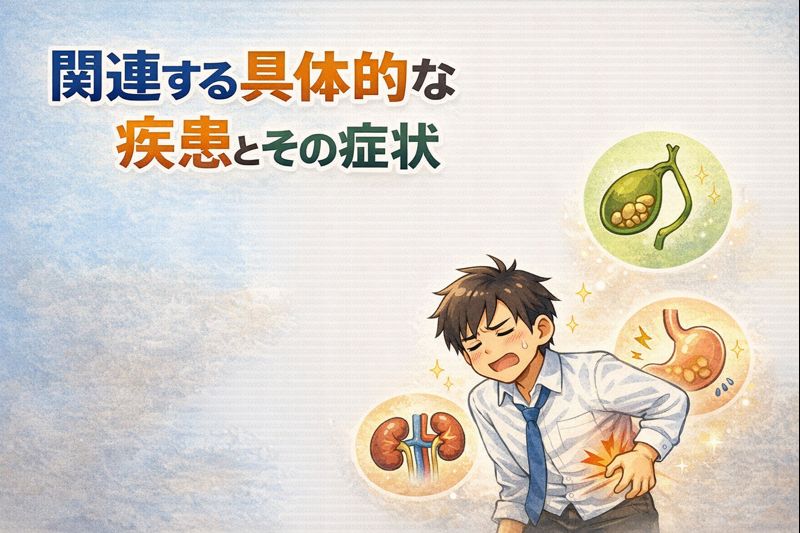 まず注目されるのが肝臓の疾患。たとえば「肝炎」や「肝臓がん」などは、右上腹部から背中にかけて痛みを感じることがあるそうです。さらに、なんとなく食欲が落ちたり、体がだるく感じるなど、はっきりしない不調が続くこともあるみたいですね。