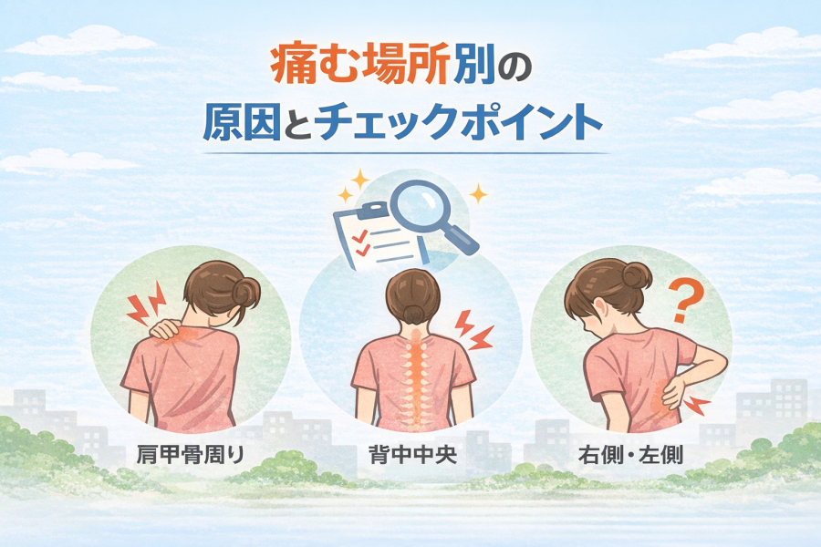 「背中が痛い」と感じたとき、まず確認したいのが“どの場所か”です。実は、痛む位置によって原因の傾向が異なると言われています。なんとなく全体が重いのか、それとも一点がズキッとするのか。場所を具体的にするだけで、見方が整理しやすくなると紹介されています。