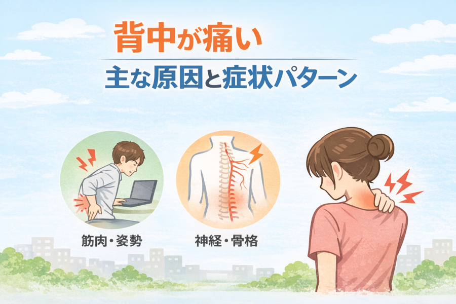「背中が痛い」とひとことで言っても、原因は一つではないと言われています。筋肉の緊張なのか、それとも神経や骨格の影響なのか、場合によっては内臓が関係しているケースもあると紹介されています。まずは大きく分けて考えると整理しやすいです。