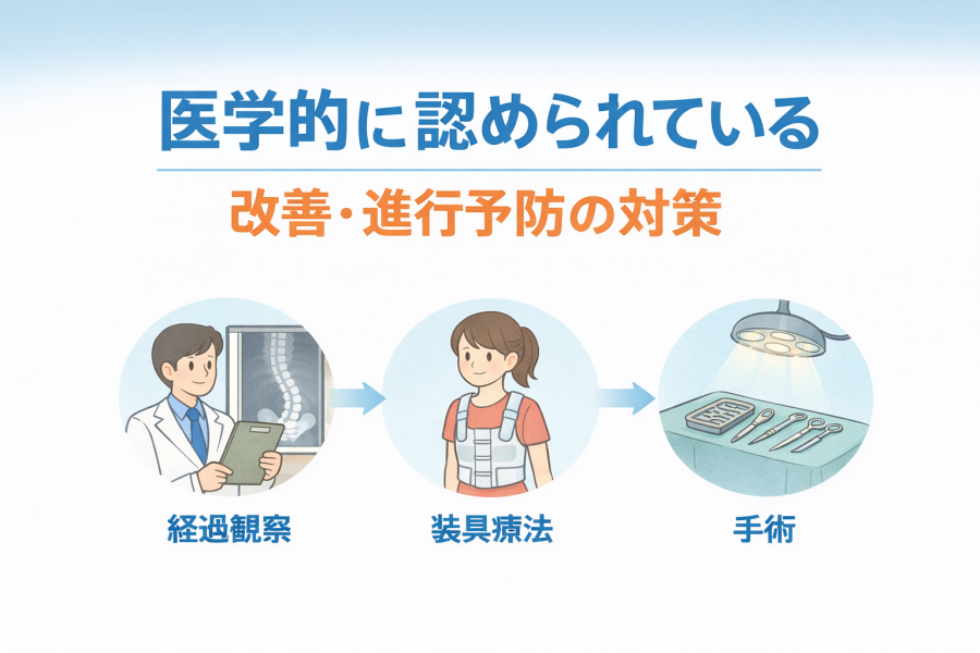 成長期か成人後かによって、選択肢は大きく変わります。また、カーブの角度や進行の有無を把握することが最優先だとされています。