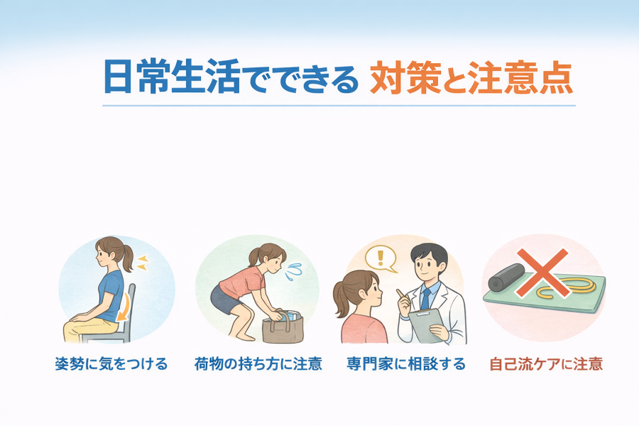 側湾症は、日常生活の過ごし方によって体への負担が変わると言われています。特に姿勢や動作のクセは、知らないうちに体の左右差を強めてしまうことがあります。