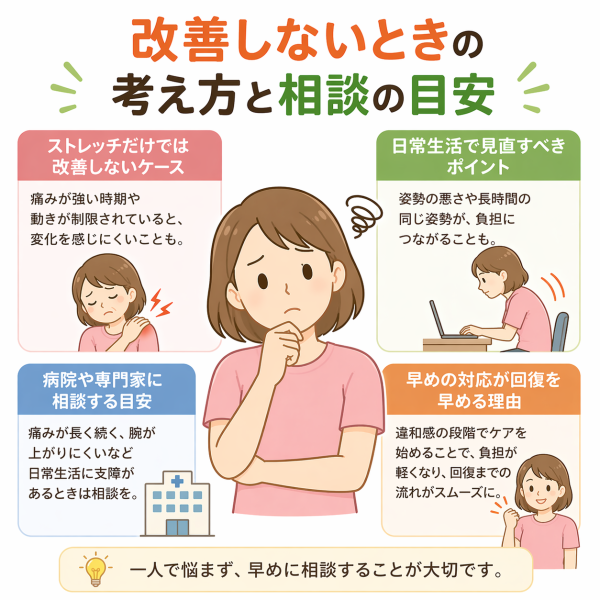 「頑張っているのに、なかなか良くならない…」そんなときは、タイミングが合っていない可能性も考えられます。例えば、急性期に無理をしたり、逆に慢性期以降でもほとんど動かさなかったりすると、回復までの期間が長くなることがあると言われています。五十肩は“いつ何をするか”がとても大切で、そのバランスが崩れると、改善まで遠回りになるケースもあるようです。「とりあえずやる」ではなく、「今の状態に合っているか」を意識することが重要とされています。少しでも違和感が強くなる場合は、やり方を見直すことも選択肢の一つです。結果として、その積み重ねがスムーズな回復につながると考えられています。
