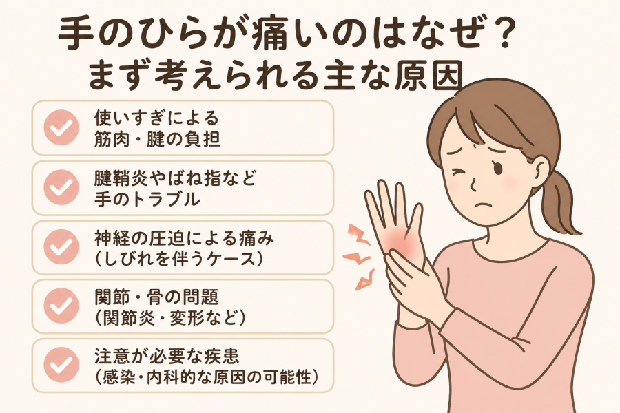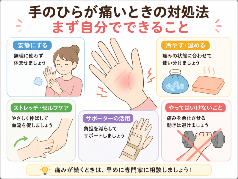 このように、手のひらの痛みは原因によって対処の考え方が変わるため、「どんな痛みなのか」を整理することが大切とされています。