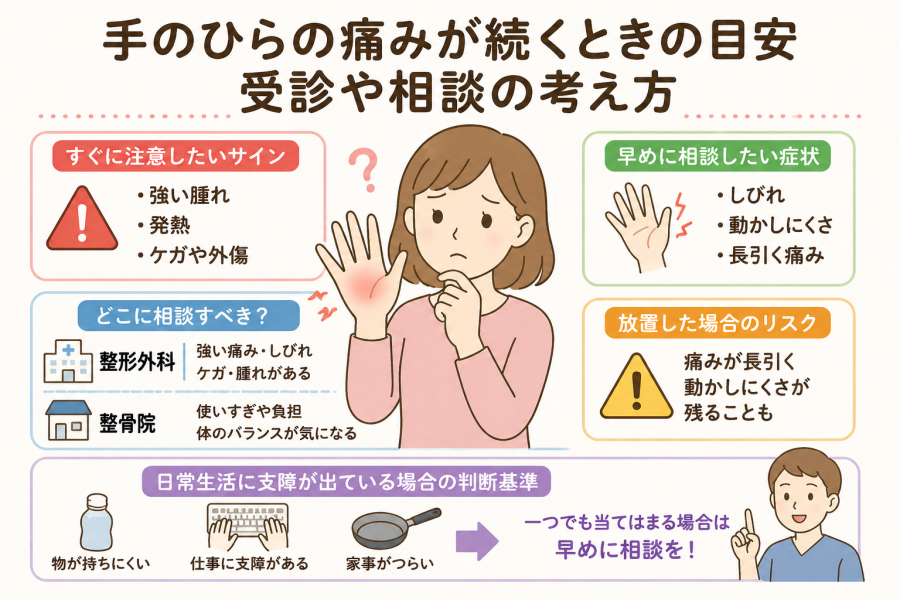 手のひらの痛みが出たとき、多くの方が迷うポイントだと思います。