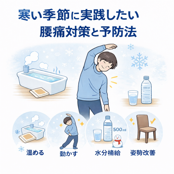 座りっぱなしを避け、定期的に立ち上がることや、正しい姿勢を意識することも腰への負担軽減につながると考えられています。さらに、冬でも水分不足になりやすいため、こまめな水分補給も血流改善に役立つと言われています。