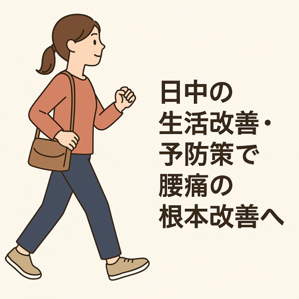 お身体の不調を緩和させるためには健康的な生活が大切です。痛みが起こってしまったときは、腰や背骨に負担をかけずに血流を良くする・筋肉を育てるようにしましょう。