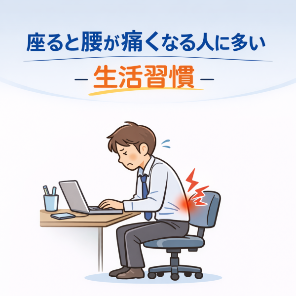 「座ると腰が痛い」と感じる人の多くに共通して見られるのが、長時間座る生活・前かがみ姿勢・運動不足といった習慣です。これらは単独ではなく、いくつか重なっているケースも多いと考えられています。