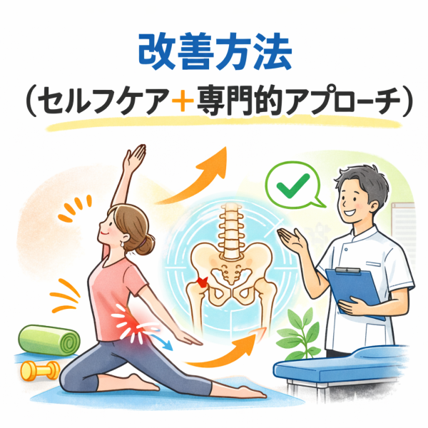 こうした質問は多いです。基本は、股関節と腰の両方に目を向けることが大切だと言われています(引用元:https://esthree.jp/column/%e8%82%a1%e9%96%a2%e7%af%80%e3%81%a8%e8%85%b0%e7%97%9b%e3%81%ae%e9%96%a2%e4%bf%82%ef%bd%9c%e5%8e%9f%e5%9b%a0%e3%83%bb%e7%97%87%e7%8a%b6%e3%83%bb%e5%b0%82%e9%96%80%e5%8c%bb%e3%81%8c%e6%95%99%e3%81%88/)。セルフケアと専門的な視点をうまく組み合わせることがポイントとされています。