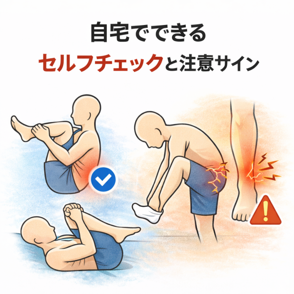 股関節と腰痛の関係を考えるとき、自宅でのセルフチェックは一つの目安になると言われています。ただし、あくまで参考レベルであり、確定的な判断ではないとされています(引用元:https://esthree.jp/column/%e8%82%a1%e9%96%a2%e7%af%80%e3%81%a8%e8%85%b0%e7%97%9b%e3%81%ae%e9%96%a2%e4%bf%82%ef%bd%9c%e5%8e%9f%e5%9b%a0%e3%83%bb%e7%97%87%e7%8a%b6%e3%83%bb%e5%b0%82%e9%96%80%e5%8c%bb%e3%81%8c%e6%95%99%e3%81%88/)。順番に確認してみましょう。