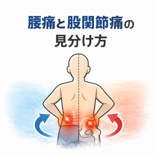 来院時によく聞く声です。腰痛と股関節痛は場所が近いため混同しやすいと言われています。ただ、痛みの出方や動作によって違いが見えることもあるとされています(引用元:https://esthree.jp/column/%e8%82%a1%e9%96%a2%e7%af%80%e3%81%a8%e8%85%b0%e7%97%9b%e3%81%ae%e9%96%a2%e4%bf%82%ef%bd%9c%e5%8e%9f%e5%9b%a0%e3%83%bb%e7%97%87%e7%8a%b6%e3%83%bb%e5%b0%82%e9%96%80%e5%8c%bb%e3%81%8c%e6%95%99%e3%81%88/)。ポイントを順に見ていきましょう。