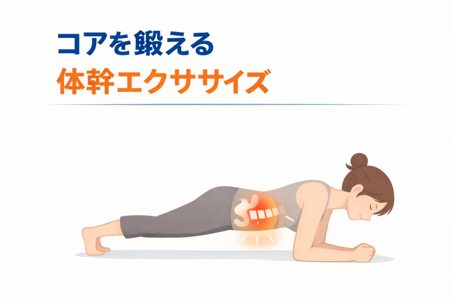 うつ伏せで肘をつき、体を一直線に保ちます。10秒から始めて少しずつ時間を伸ばします。