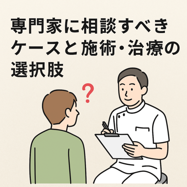 手術療法が必要になる場合もありますが、それは症状が強く、日常生活に支障が出るケースに限られると言われています。自己判断では判断しづらいため、専門家と相談しながら進める流れが一般的です。