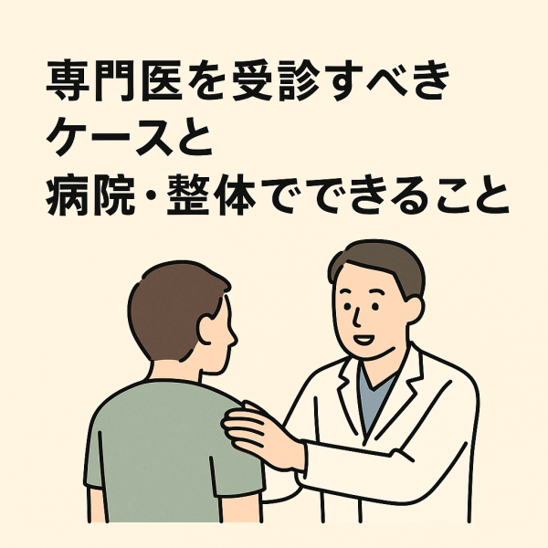 医療機関と整体を併用することで、自宅ケア・改善・予防までを長期的に見通しやすくなるとも言われています(引用元: https://kumanomi-seikotu.com/blog/4132/ )。