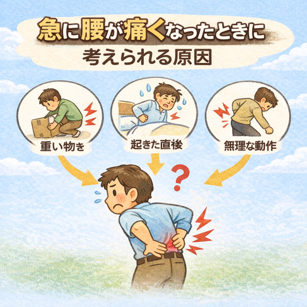 「重い物を持ち上げた直後に痛くなった」「朝起きて動き出した瞬間につらくなった」というケースもよくあります。これは、体が十分に動く準備ができていない状態で負荷がかかったため、と言われています。特に起床直後は筋肉や関節がまだ硬く、少しの動作でも腰に影響が出やすいようです。