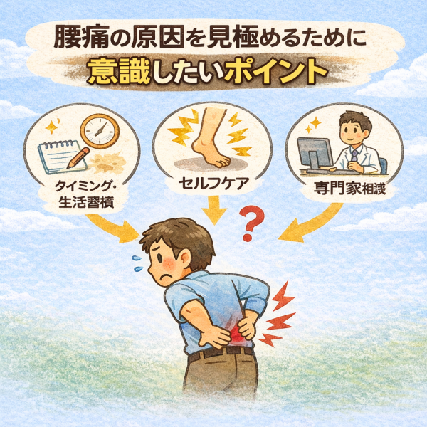 「これが原因だ」と思い込むと、かえって遠回りになることもあります。「もしかしたら他にも関係しているかも?」と少し視野を広げるだけで、体の見方は変わります。腰痛 原因を考えるときは、今の生活や体の状態を振り返りながら、段階的に整理していく姿勢が大切だと言われています。