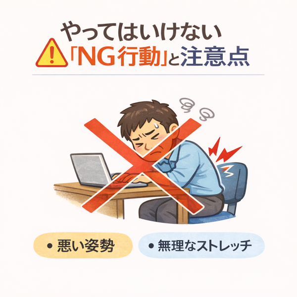 腰痛で寝れない状態が続くと、こうした行動をとりがちです。ただ、良かれと思ってやったことが、かえって腰の負担を増やしてしまう場合もあると言われています。ここでは、特に注意したいポイントを整理しておきましょう。