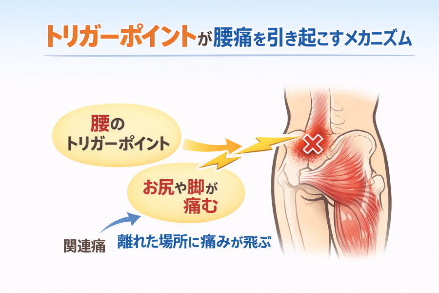 こうした生活習慣が重なることで、筋肉が硬くなり、トリガーポイントが形成されやすくなる可能性があると考えられています。その結果、腰だけでなく関連痛として別の部位に違和感が出ることもあるそうです。