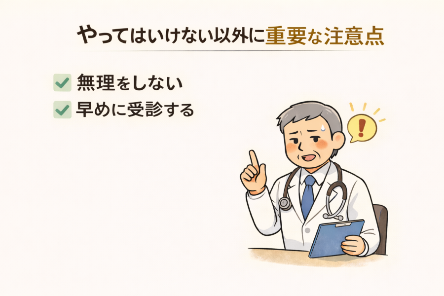 何気ない動作が積み重なり、結果として痛みが長引くこともあると考えられています。では、具体的なNG行動を確認していきましょう。