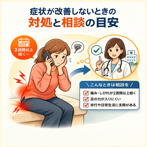 特に、痛みやしびれが長く続く場合は、原因が複雑に絡んでいる可能性もあるため、無理に自己判断だけで続けるよりも、一度整理することが大切と考えられています。ここでは、相談の目安や考え方をわかりやすくまとめていきます。